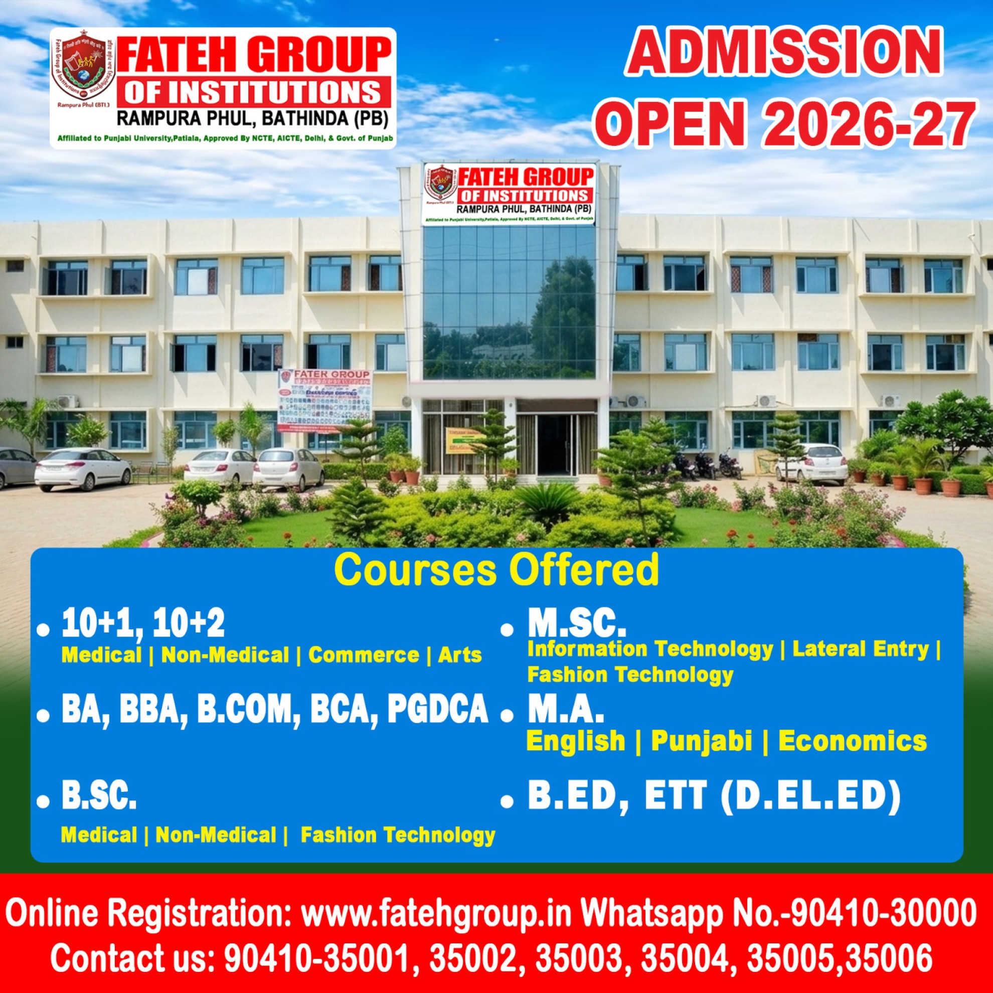 Fateh Group of Institutions is a premier educational hub located on NH-254, Maur Road, Rampura Phul, Bathinda, Punjab. It is committed to delivering quality higher education combined with holistic personality development in the Malwa region.